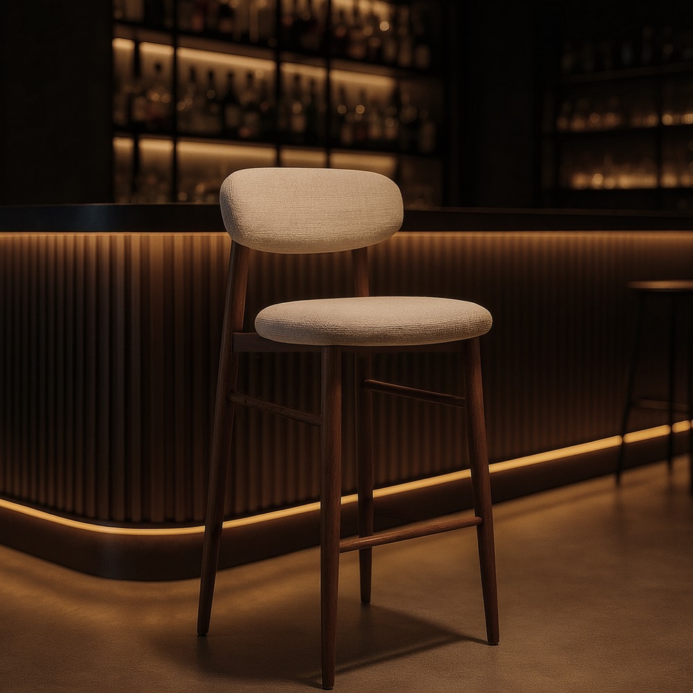 TABURETE 75CM BEIGE TEJIDO-METAL 54 X 52 X 105 CM Material: tejido 100% poliéster – metal (acero) Tejido repelente al agua. Altura asiento: 75cm. Altura respaldo: 35cm. Ancho asiento: 46cm. Precisa montaje. No apilable. Cumple normativa: EN16139:2013